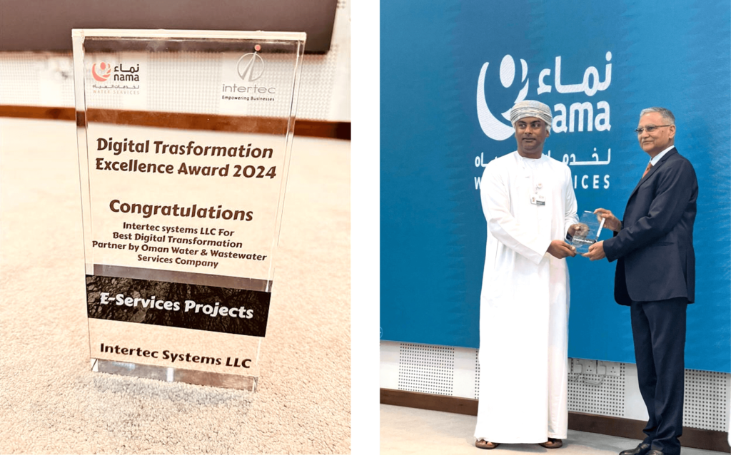 We are thrilled to announce that Intertec has been honored with the prestigious Digital Transformation Excellence Award 2024 for Best Digital Transformation Partner for E-Services Projects by one of our esteemed clients, the Oman Water and Wastewater Services Company (Nama Water Services). This recognition underscores our unwavering commitment to revolutionizing public service delivery through cutting-edge digital solutions.